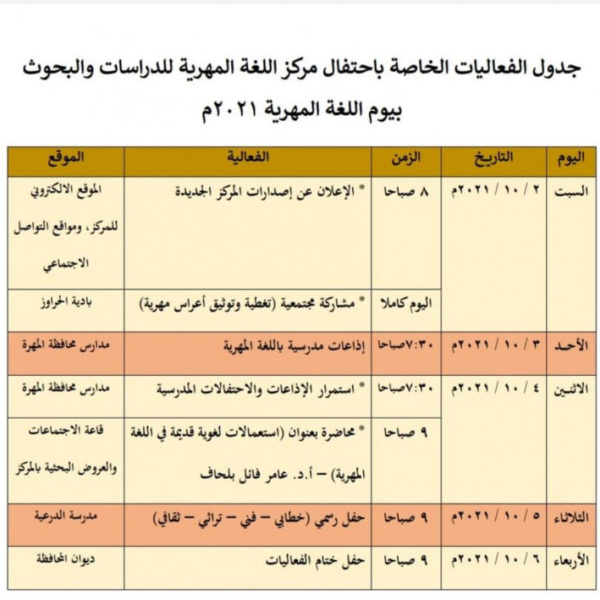 الإعلان عن جدول الفعاليات الخاصة باحتفال مركز اللغة المهرية للدراسات والبحوث بيوم اللغة المهرية ٢ أكتوبر ٢٠٢١مأكتوبر 1, 2021