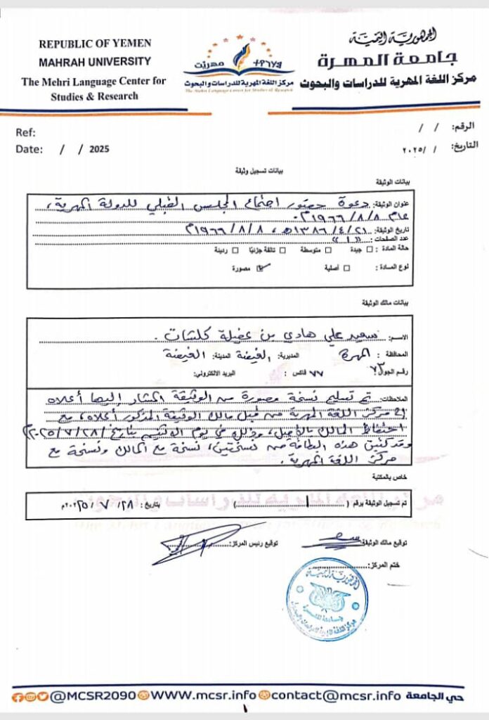 تجدر الإشارة إلى أن مركز اللغة المهرية أطلق مؤخرًا مشروعًا واسعًا يهدف إلى جمع وحصر المخطوطات والوثائق القديمة لدى الأسر والعائلات، وذلك في إطار مساعيه لبناء ذاكرة لغوية وتاريخية موثّقة تحفظ التراث المهري من الاندثار، وتوفر للباحثين والمختصين مصادر أصيلة لدراستها.