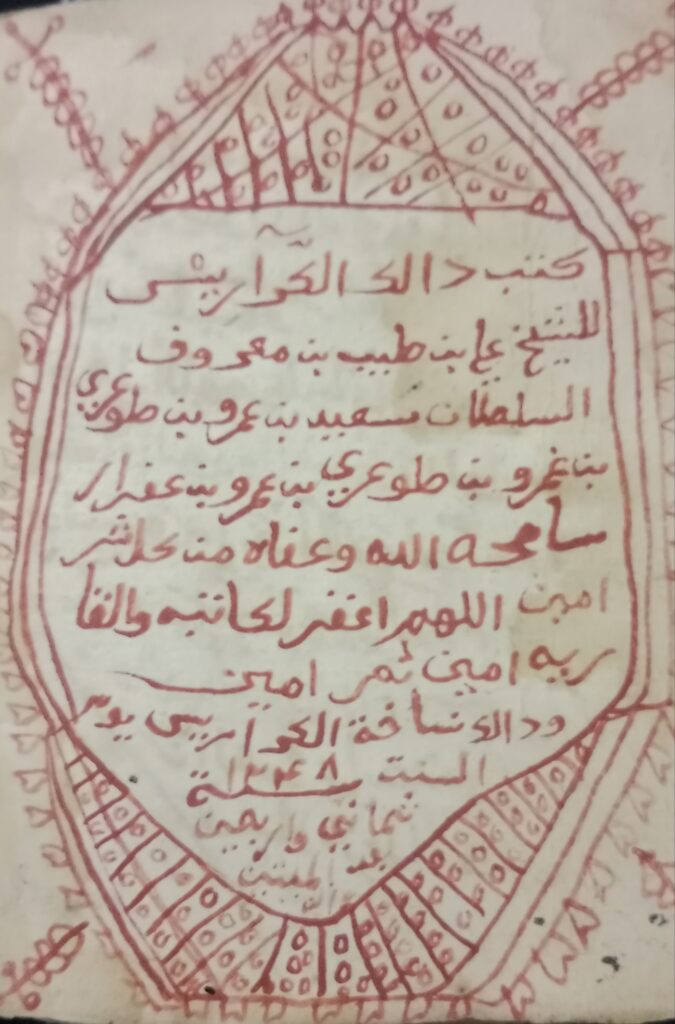 وتضمنت المادة المسلمة مخطوطًا، كتبه الشيخ علي بن طيب بن معروف، للسلطان سعيد بن عمرو بن طوعري بن عمرو بن طوعري بن عمرو بن عفرار، في عام ١٢٤٨هـ، وهو عبارة عن كراريس في 47 لوحًا، تحوي مجموعة أذكار وسور وأدعية لختم القرآن الكريم، بمقاس 15سم×11سم، وتضمن الآخر كراس في نسب آل باعباد، يعود لشهر جمادى الآخرة من عام 1241ه .