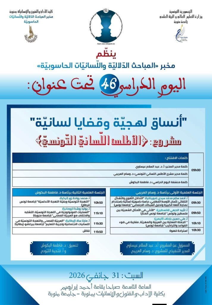 ضمن خطى تعزيز الحضور الدولي للبحث العلمي، شارك الأستاذ علي حسين بلحاف عضو وحدة الدراسات والبحوث في مركز اللغة المهرية بجامعة المهرة، اليوم السبت، في أعمال اليوم الدراسي السادس والأربعين الذي نظمه مخبر المباحث الدلالية واللسانيات الحاسوبية، بكلية الآداب والفنون والإنسانيات بجامعة منُّوبة في تونس، والذي جاء تحت شعار: “أنساق لهجية وقضايا لسانية: مشروع الأطلس اللساني التونسي”.