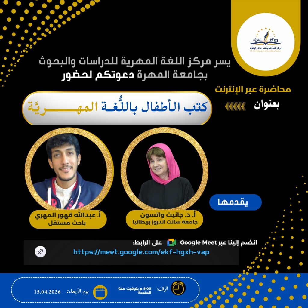 يسر مركز اللغة المهرية للدراسات والبحوث بجامعة المهرة دعوتكم لحضور محاضرة عبر الانترنت بعنوان :
