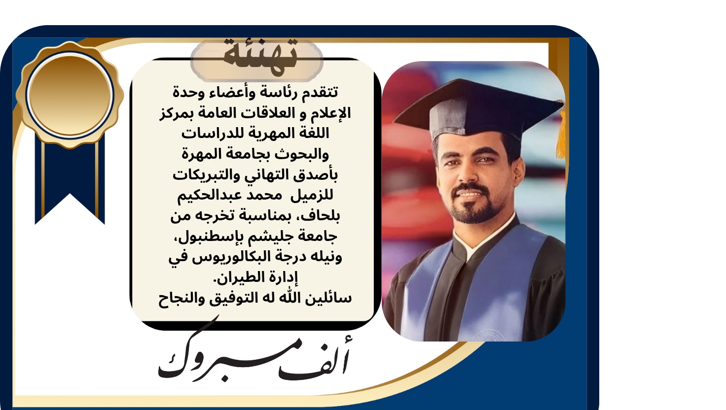 تتقدم رئاسة وأعضاء وحدة الإعلام و العلاقات العامة بمركز اللغة المهرية للدراسات والبحوث بجامعة المهرة بأصدق التهاني والتبريكات للزميل محمد عبدالحكيم بلحاف، بمناسبة تخرجه من جامعة جليشم بإسطنبول، ونيله درجة البكالوريوس في تخصص إدارة الطيران.